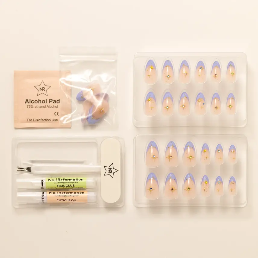 Purple Starlight sizi bir tırnakta dilek tutmaya ve zarafet ve cazibe hayallerinizin gerçeğe dönüşmesini izlemeye davet ediyor. Bu tasarım, lavanta ve leylak tonlarında çiçek açan, altın yıldız patlamaları ve mücevherlerle süslenmiş orta badem tırnaklarla, yıldızlarla dolu bir gecenin büyüleyici ışıltısına bir övgüdür. Tırnaklarınıza her bakışınızda bir yıldızda dilek tutmanın büyüsünü hatırlayın, yıldız ışığınızla, yıldız parlaklığındaki cazibenizle geceyi aydınlatırken.