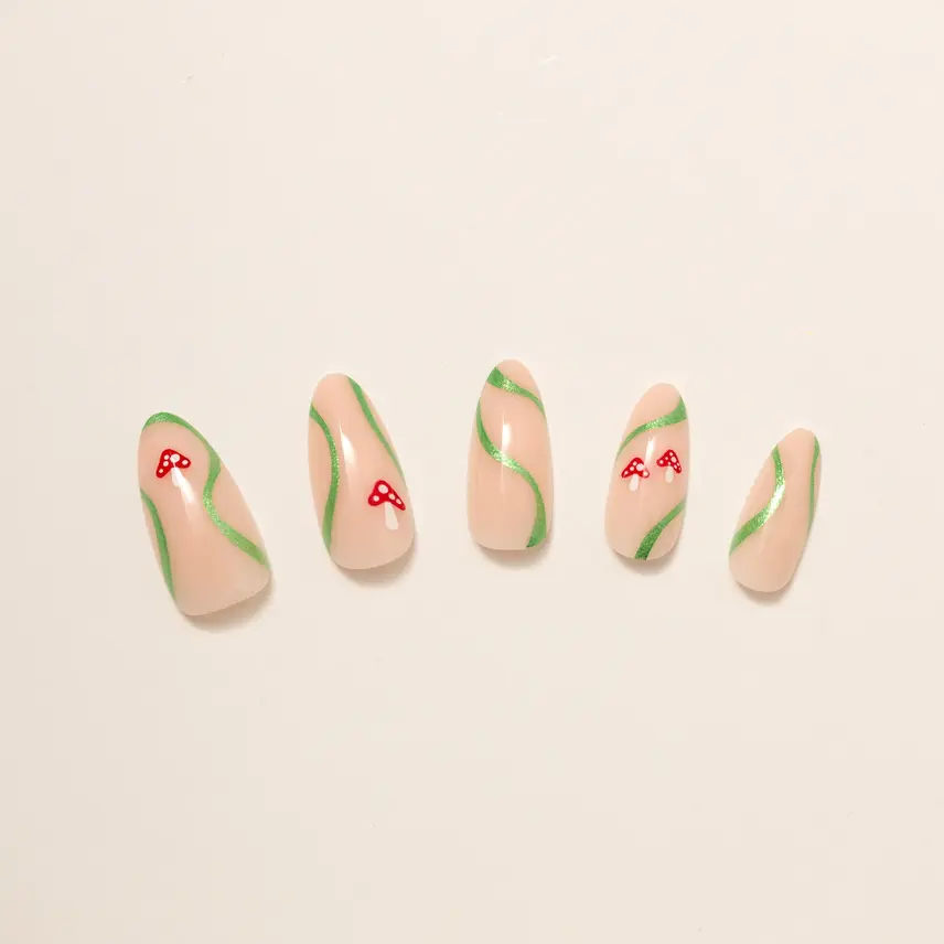 Peri Ormanı tırnak setimizin büyülü dünyasına adım atın. Kış harikalar diyarının ruhunu çağrıştıran mistik yeşil simli kıvrımlarla süslenmiş çıplak tırnaklarla tatil sezonunun büyüsünü deneyimleyin. Bu orta uzunluktaki badem şeklindeki tasarıma bir tutam tatil büyüsü katan kırmızı mantarların tuhaf cazibesinin tadını çıkarın. İçinizdeki büyücüyü serbest bırakın ve Peri Ormanı tasarımının sizi tatil harikaları ve neşesi dünyasına taşımasına izin verin.